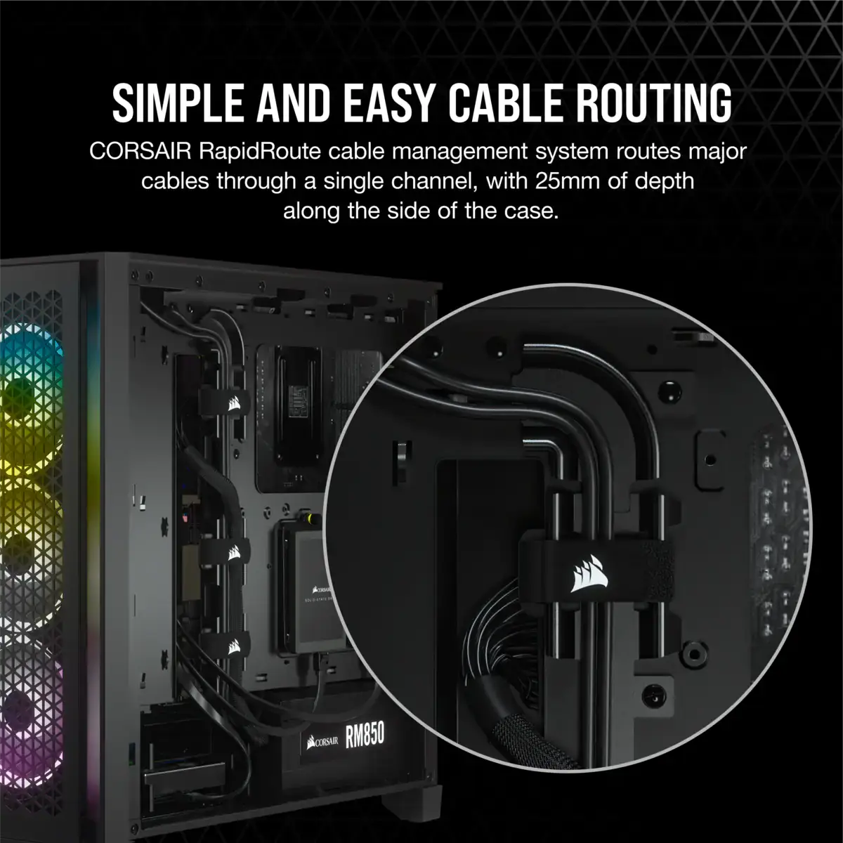 Chasis ATX semitorre distintivo, optimizado para disponer de un elevado caudal de aire, con una sencilla gestión del cableado y dos ventiladores CORSAIR AirGuide de 120 mm incluidos para que la refrigeración sea excepcional.