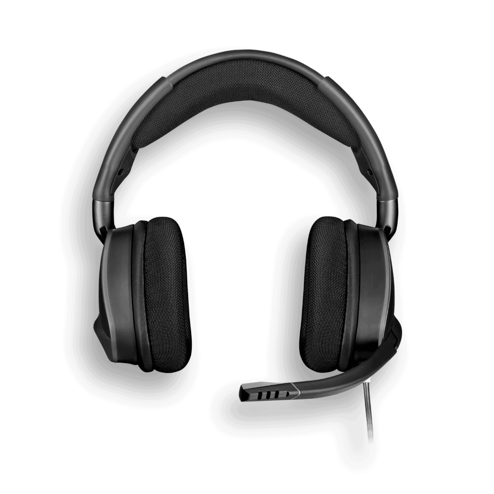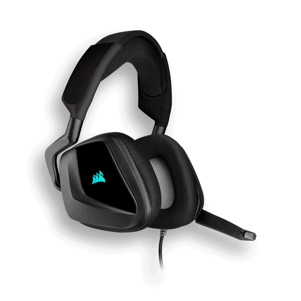 Sumérjase en la acción con los CORSAIR VOID RGB ELITE USB, con transductores de audio de neodimio de 50 mm de ajuste personalizado, un cómodo tejido de rejilla de microfibra con almohadillas de espuma con memoria y un micrófono omnidireccional.