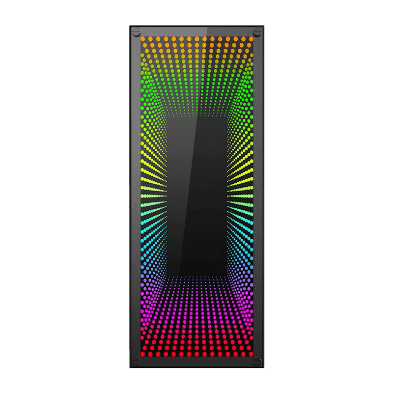 La GameMax M908 Abyss con un espejo infinito con iluminación LED RGB en la parte frontal y un panel frontal de vidrio templado con un panel lateral de metacrilato.