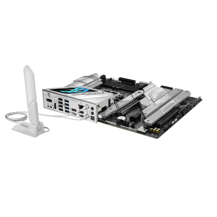 El ROG Strix Z790-A II abraza audazmente la luz, para una versión alternativa de los temas de construcción de su hermano oscuro y melancólico, la Strix Z790-F. Los disipadores de calor metálicos plateados resaltan sobre un fondo oscuro de PCB y llaman la atención sobre la alta capacidad de gestión térmica de la placa. Una capa transparente en el escudo de E/S agrega un toque único y enfatiza el logotipo RGB personalizable que se encuentra debajo. Todo el diseño está unido con detalles centrados en ROG en la placa, los disipadores de calor y la placa de E/S para una perspectiva vibrante y futurista. Combina el Strix Z790-A II con otros productos del diverso ecosistema ROG para crear una configuración de juego totalmente personalizada que refleje tu estilo personal.